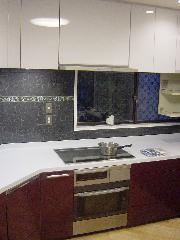 - 個人邸のキッチンカウンターです。カウンタートップは曲線で結ばれている人工大理石です。カウンター下には、食洗機、、収納がきれいに納められ、腰部の鏡面塗装の輝きが室内の明るさと調和しています。